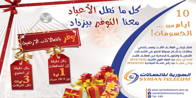 أعلنت الشركة السورية للاتصالات عن حملة تخفيضات كبيرة بمناسبة الأعياد على أجور الاتصالات القطرية والخلوية الصادرة من الهاتف الثابت ضمن عرض ترويجي بعنوان “كل ما تطل الأعياد … معنا التوفير بيزداد”.