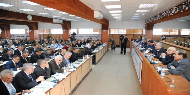 وقدم الحلقي عرضا للواقع الاقتصادي والخدمي في ظل الاستهداف الإرهابي الممنهج للمؤسسات والذي “أدى لتدني الموارد العامة والمؤشرات الخدمية من كهرباء ومياه ونقل إضافة لتراجع المستوى المعيشي من أجل إخضاع الشعب السوري” مبينا أن الحكومة عملت على تحقيق التوازن بين الموارد والامكانيات المتاحة لتعزيز صمود الشعب والجيش وصمود المؤسسات والشركات الإنتاجية.