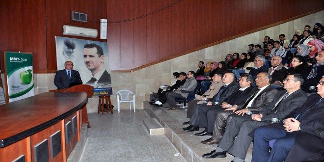 واستعرض عميد كلية الصيدلة بالجامعة الدكتور وليد خدام في محاضرته الصادات الحيوية وآلية عملها وبنية الخلية الجرثومية حيث تصنف الأحياء الدقيقة إلى جراثيم وفيروسات وطفيليات وفطريات والتي تؤدي إلى الانتانات.