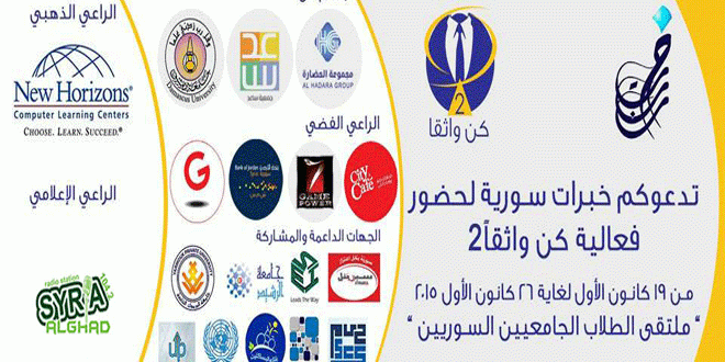 انطلقت مؤخرا في قاعة رضا سعيد في جامعة دمشق فعاليات الملتقى السنوي للطلاب الجامعيين السوريين الذي يقيمه فريق خبرات سورية بنسخته الثانية تحت شعار كن واثقا 2 حيث يستمر الملتقى الذي يقام بالتعاون مع جامعة دمشق حتى السادس والعشرين من الشهر الجاري بمشاركة اكثر من 160 طالبا وخريجا ممن يقدمون افكارا متنوعة قابلة للتطوير بدعم من الجهات المنظمة.