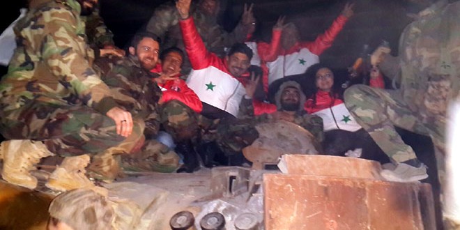 من جانبهم أكد الجنود استمرارهم بتنفيذ مهمتهم الوطنية في ملاحقة الإرهابيين المأجورين حتى اعادة الامان والاستقرار إلى كل المناطق السورية وانهم لن يبخلوا بأي غال في سبيل عزة الوطن وسيواصلون مسيرة تضحياتهم لتنعم سورية وشعبها بالأمن والأمان والاستقرار.