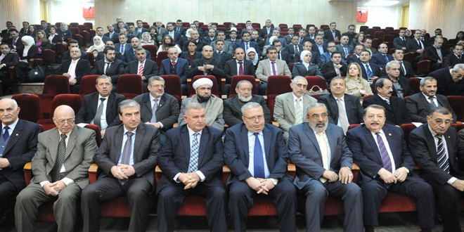وأضاف إن الظروف التى تمر بها سورية ستكون ميدانا ينمي فيه طلاب المعهد قدراتهم ومعارفهم لأنهم سيواجهون قضايا ودعاوى “لم تكن معروفة في المجتمع السوري وأفرزتها الأزمة من جرائم إرهابية يعجز البيان عن وصفها من قتل وتخريب وتدمير ممنهج وذبح وقطع للرؤوس وتقطيع للاوصال وخطف وقتل للنساء والأطفال ورجم المدن بالقذائف ومئات الجرائم التي وفدت مع ذلك الإرهاب من خارج سورية بدعم من دول إقليمية وقوى دولية تتشدق بحقوق الإنسان من جهة ومن جهة أخرى تراقب كيف يفتك الإرهاب بالسوريين”.