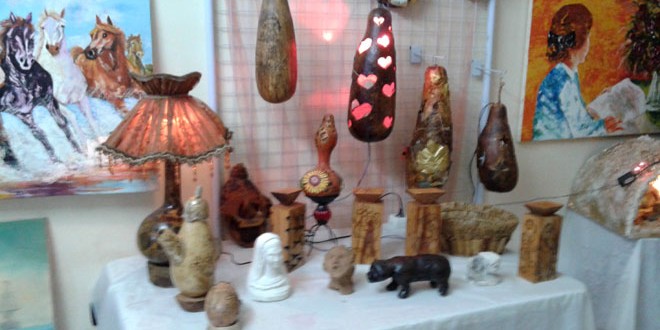 الفنان التشكيلي “شادي سليمان” تحدث عن مشاركته في المعرض مشيرا إلى انه ركز في أعماله على تقنيات الحفر والحرق والنحت مع استخدامه مواد خام موجودة في الطبيعة كنبتة اليقطين التي قام بتفريغها وزخرفتها ووضع إضاءة داخلها لتكون قطعة فنية مميزة بالإضافة إلى الحفر على جذوع الأشجار بطريقة مبتكرة كما صمم بئرا خشبية وساعات وغيرها من القطع.