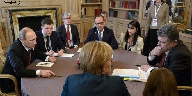 ونقل موقع روسيا اليوم عن بيان للكرملين قوله “إن اتصالا هاتفيا جمع الرئيس الروسي فلاديمير بوتين والمستشارة الألمانية أنجيلا ميركل والرئيس الفرنسي فرانسوا هولاند والرئيس الأوكراني بيترو بوروشينكو لبحث الأزمة الأوكرانية ناقشوا خلاله بالتفصيل الوضع الذي لا يزال متوترا وغير مستقر في الجنوب الشرقي من أوكرانيا في إطار تنفيذ ما تمت الموافقة عليه من اتفاقات في ال12 من شباط الماضي في مينسك حيث تمت الموافقة على تمديد العمل بالاتفاقية لمدة عام”.