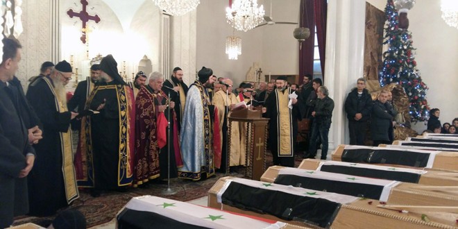 شيع أهالي مدينة القامشلي اليوم جثامين شهداء التفجيرين الإرهابيين اللذين وقعا في المدينة مساء أمس وذلك من كنيسة السيدة العذراء للسريان الأرثوذكس في مركز المدينة بمشاركة فعاليات رسمية ودينية وشعبية أهلية.