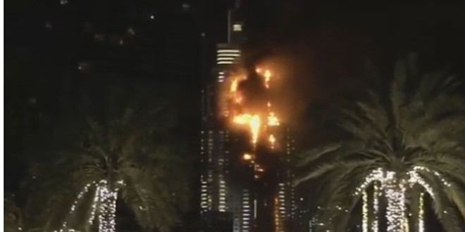 أعلنت سلطات إمارة دبي إصابة 16 شخصا جراء حريق اندلع مساء اليوم في فندق فخم قرب برج خليفة الاعلى في العالم قبيل بدء احتفالات رأس السنة.