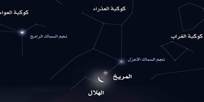 يشهد مساء يوم غد الأحد اقتران الهلال القديم لشهر ربيع الأول مع كوكب المريخ على مسافة قريبة جداً بحيث يكاد يحجبه ويكون هذا الاقتران في كوكبة العذراء.