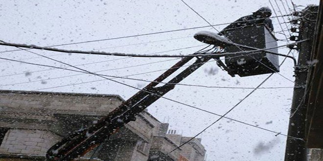 وفي حمص أكد مدير شركة الكهرباء المهندس مصلح الحسن استمرار العمل لإصلاح أعطال شبكات التوتر المنخفض والمتوسط في ظل الظروف الجوية السائدة بالمحافظة والتي أثرت على التغذية في مناطق متعددة ولا سيما الريف الغربي الذي ناله “النصيب الأكبر من الأعطال”.