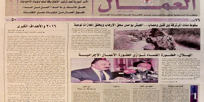 وفي افتتاحيته التي جاءت بعنوان 2016 والأهداف الكبرى رأى رئيس الاتحاد العام لنقابات العمال جمال القادري أن العام الجديد سيحمل انفراجات كبرى على كل الصعد من “منطق الواثقين بمبادئهم وبقضيتهم العادلة والواثقين بوطنهم وشعبهم وقدرته على الاستمرار في الصمود والتصدي للمؤامرة الكبرى والحرب الإرهابية ومن يقف وراءها”.