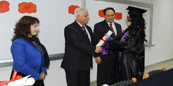 احتفلت جامعة دمشق اليوم بتخريج دفعة جديدة من طلاب قسم اللغة الفرنسية في كلية الآداب والعلوم الإنسانية للعام الدراسي 2014-2015 وكرمت المتفوقين منهم.