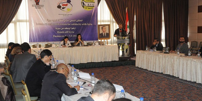 وكانت أعمال الملتقى الشبابي الدولي للتضامن مع سورية الذي تقيمه منظمة اتحاد شبيبة الثورة بالتعاون مع اتحاد الشباب العالمي المناهض للامبريالية تحت عنوان “ارفعوا أيديكم عن سورية” انطلقت صباح أمس بمشاركة منظمات شبابية من 20 دولة عربية وأجنبية منها لبنان والعراق واليمن وفلسطين والجزائر ومصر والسودان وكوريا الديمقراطية وتركيا والمانيا وهولندا وايرلندا وليبيا والاردن وجزر القمر.