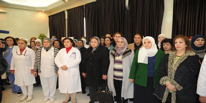 حضر التكريم معاون وزير التعليم العالي للشؤون الصحية الدكتور حسن الجبه جي وعميد كلية الطب البشري الدكتور صلاح الشيخة وعدد من الأطباء ورؤساء الأقسام والشعب الطبية في المشفى.