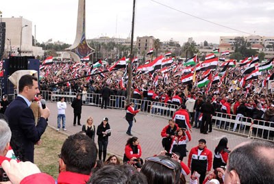 محافظات-سانا فاجأ السيد الرئيس بشار الأسد من مكتبة الأسد الصرح الثقافي العريق المحتشدين في ساحة الأمويين بانضمامه إليهم وتحيته لهم مؤكدا على المضي معهم من أجل سورية المتجددة مخاطبا إياهم بالقول: أردت أن أكون معكم في ساحة الأمويين في قلب دمشق عاصمة المقاومة والتاريخ والحضارة. وقال الرئيس الأسد للمحتشدين: أتيت إلى هنا لكي نضع أيدينا مع بعضنا وننظر إلى المستقبل.. إلى الأمام.. إلى سورية التي نحب.. سورية القوية الشامخة.. سورية الكرامة والعزة.. ولنسير إلى الأمام.. نقبض بيد على الإصلاح وبالأخرى على مكافحة الإرهاب. وفي مشهد عكس حالة الوعي والحس الوطني العالي للشعب السوري توافدت حشود ضخمة منذ صباح أمس إلى ساحات الوطن دعما لخطاب السيد الرئيس بشار الأسد وبناء سورية المتجددة وتأكيدا على الوحدة الوطنية ورفضا للتدخلات الخارجية في الشؤون الداخلية السورية مؤكدين العزم والاصرار على مواصلة العمل للوصول إلى سورية المنشودة التي رسم ملامحها الرئيس الأسد في خطابه . وتوافدت الحشود إلى ساحات الأمويين بدمشق وسعد الله الجابري بحلب والمحافظة باللاذقية والسبع بحرات بدير الزور والقائد الخالد بالحسكة ودوار البريد بدرعا والمجاهد سلطان باشا الأطرش وتشرين والشارع المحوري بالسويداء والرئيسية في مدينتي سلقين وجسر الشغور وبلدة ابو الظهور بإدلب والأهرام بحمص والقائد الخالد بالرقة مرددة الهتافات التي تعكس الصورة الحضارية للشعب السوري وتؤكد قدرته بوعيه وإخلاصه والتفافه حول قيادته على مواجهة جميع الضغوط والحملات المغرضة التي تستهدف زعزعة أمن واستقرار سورية بهدف حرفها عن نهجها القومي الذي تحرص من خلاله على حفظ حقوق ومصالح الأمة العربية ومنع استغلالها من قبل قوى الهيمنة والاستعمار. ورفع المشاركون الأعلام الوطنية واللافتات التي تؤكد التفاف الشعب السوري حول قيادته وتنوه بتضحيات الجيش العربي السوري في سبيل عزة ورفعة واستقرار الوطن وتدعو إلى نبذ الفتنة ورفض حملات التحريض والتضليل التي تقودها بعض وسائل الإعلام عبر تزييفها الحقائق وفبركتها الأكاذيب الهادفة لنشر الفوضى والنيل من أمن واستقرار سورية. ففي دمشق .. عبرت الحشود الضخمة في ساحة الأمويين عن دعمها لما جاء في خطاب الرئيس الأسد الذي يرسم آفاق سورية المتجددة مؤكدة رفضها للتدخلات الخارجية في الشؤون الداخلية السورية مع الإصرار وتمسكها بالوحدة الوطنية وإصرارها على مواصلة العمل لبناء سورية. وردد المشاركون قسم الولاء للرئيس الأسد .. نقسم بالله العظيم نقسم بالله العظيم ..نقسم بالله العظيم.. نقسم يا سيد البلاد أن نضع يدنا بيدك لنحمي سورية ممن يسعى لدس الهزيمة بيننا .. نصمد معك وبك ..نستمر معك وبك .. وننتصر معك وبك وأن نبقى معك في مكان واحد متحدين غير منقسمين وأن نقف معك صفا واحدا داعمين للجيش العربي السوري وأن تبقى حناجرنا تهتف بالعزة والكرامة وأن تبقى المقاومة في قلب هويتنا العربية دمت لنا قائدا ودمت لنا سيدا للوطن ودامت سورية بخير بك. وفي تصريحات لوكالة سانا أكد محمد شعبان عزوز رئيس الاتحاد العام لنقابات العمال أن خطاب السيد الرئيس أعاد لنا الأمل والثقة لنفوسنا جميعا بصلابة موقفه إزاء الأوضاع التي يتعرض لها بلدنا الحبيب وسنبقى على العهد للوطن وقائده المفدى وسنقدم التضحيات فداء لتراب سورية الثمين. وقال جمال القادري رئيس اتحاد عمال دمشق نحن نعتز بكل عربي يريد الأمان والسلام لسورية والأراضي العربية كافة وندعو لجنة المراقبين أن ينقلوا الحقيقة كما هي بموضوعية وصدق ومهنية لإظهار ما يجري على هذه الأرض الطيبة للمجتمع الدولي والعربي خاصة أن القنوات المغرضة والمضللة ومن خلال حملاتها التحريضية تسعى لتشويه صورة الشعب السوري مؤكدا أن هذا الشعب خرج بملايينه لساحات الوطن مؤيدا لمسيرة الإصلاح ورافعا شعار الوحدة الوطنية. وقال شعبان شعبان أمين سر اتحاد عمال دمشق إن المؤامرة على سورية قد فشلت رغم حجم الضغوطات التي تمارس والعقوبات التي فرضت عليها وس