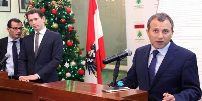 وقال باسيل في مؤتمر صحفي عقده اليوم في بيروت مع وزير الخارجية النمساوي سيباستيان كورتز ونقلته الوكالة الوطنية للاعلام: “إن سورية المستقرة والقوية هي في مصلحة لبنان ولبنان المستقر والقوي هو في مصلحة سورية” داعيا إلى ضرورة محاربة انتشار الإرهاب وتفكيك شبكة تجنيد الارهابيين الالكترونية تدريجيا والقضاء على تنظيم “داعش” الإرهابي.