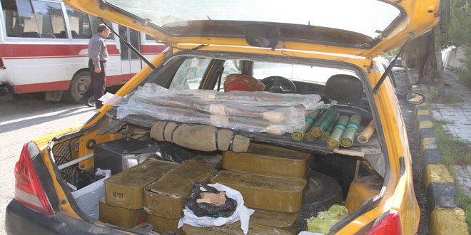 وأفاد مصدر في المحافظة لمراسل سانا بأن الجهات المختصةضبطت أمس سيارة محملة بكميات كبيرة من الذخائر المتنوعة والقنابل في قرية خربة المعزة على طريق طرطوس صافيتا كانت متجهة إلى حماة.