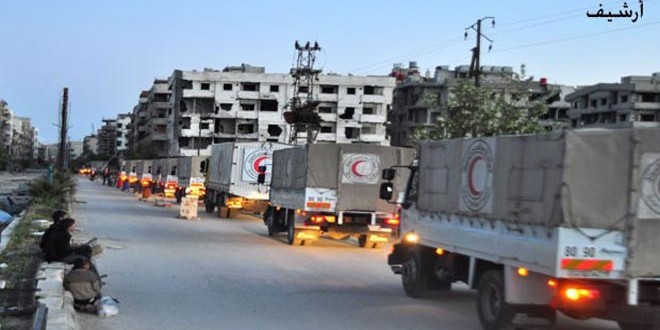 وقال مراسلو سانا إن قافلة مساعدات إنسانية توجهت باتجاه بلدتي الفوعة وكفريا بريف إدلب المحاصرتين من قبل التنظيمات الإرهابية المرتبطة بنظام آل سعود بالتزامن مع إدخال قافلة مساعدات باتجاه بلدة مضايا في ريف دمشق وذلك بإشراف الهلال الأحمر العربي السوري والصليب الاحمر الدولي والأمم المتحدة.