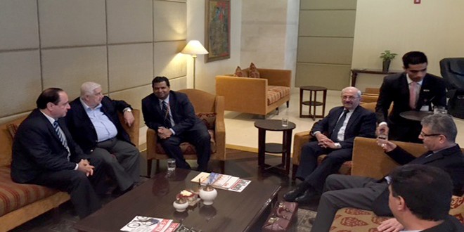 بحث نائب رئيس مجلس الوزراء وزير الخارجية والمغتربين وليد المعلم في نيودلهي مساء اليوم مع مستشار الأمن القومي الهندي آجيت دوفال الأوضاع السياسية في منطقة الشرق الأوسط والجهود المبذولة لمكافحة الإرهاب وسبل إيجاد حل سياسي للأزمة في سورية وتعزيز العلاقات الثنائية بين البلدين الصديقين.