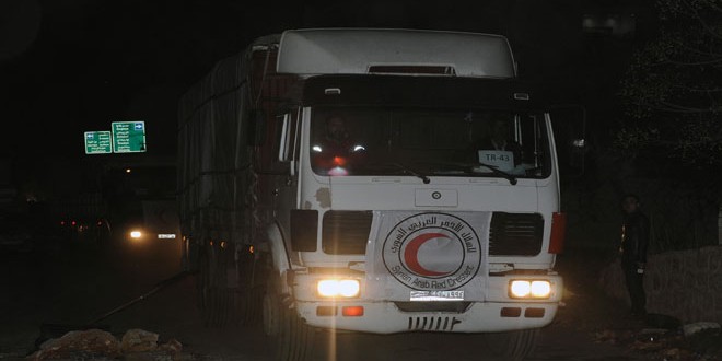 تم بإشراف الأمم المتحدة والهلال الأحمر العربي السوري والصليب الأحمر الدولي اليوم إدخال 65 شاحنة محملة بالمساعدات غلى بلدات مضايا وكفريا والفوعة بريفى دمشق وإدلب.