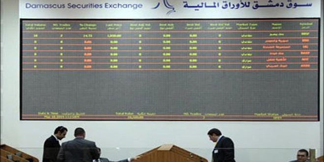 وصلت قيمة تداولات سوق دمشق للأوراق المالية في جلستها اليوم الى 428ر10 ملايين ليرة وحجم تداول بلغ 103854 سهما توزعت بين 49 صفقة وارتفع مؤشر السوق 03ر4 نقاط عن الجلسة الماضية وبنسبة تغير موجبة قدرها 33ر0 بالمئة واغلق عند قيمة 43ر1220 نقطة.