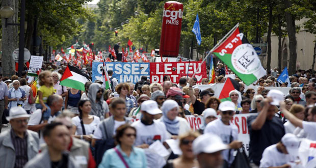 وذكرت وكالة الصحافة الفرنسية إن المتظاهرين نددوا بالعدوان الإسرائيلي وبموقف الحكومة الفرنسية الداعم له هاتفين “إسرائيل قاتلة وهولاند متواطئ معها” مشيرة إلى أن هذه المظاهرات جرت في باريس وليون ومرسيليا ومونبيلييه وافينيون وليل بينما جرت المظاهرة الرئيسية بباريس وضمت نحو 20 ألف متظاهر بحسب المنظمين.