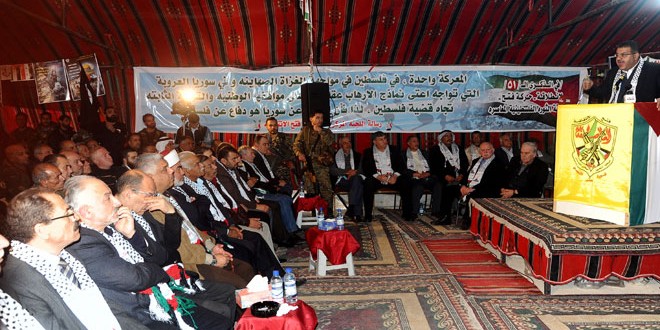 بدوره أوضح أمين سر تحالف فصائل المقاومة الفلسطينية خالد عبد المجيد أن الشعب الفلسطيني الذي انطلق بانتفاضته الثالثة ضد الاحتلال الصهيوني يؤكد أنه لم يفقد البوصلة باتجاه تحرير وطنه من الاحتلال واستعادة كامل حقوقه مستخدما كل أشكال المقاومة وبدعم ومساندة لم تتوقف من سورية وحزب الله وإيران وكل القوى المقاومة لافتا إلى ضرورة وقوف كل الفصائل الفلسطينية صفا واحدا مع الدولة السورية في الحرب على الإرهاب والعمل معها لإعادة الأهالي إلى المناطق والمخيمات التي تم تهجيرهم منها من قبل التنظيمات الإرهابية التكفيرية.