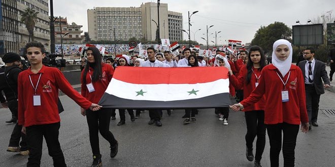 ضمن فعاليات المنافسات النهائية للاولمبياد العلمي السوري نظم المشاركون فيه صباح اليوم مسيرة علمية من فندق الشيراتون مرورا بساحة الأمويين باتجاه الهيئة العامة لدار الأسد للثقافة والفنون بدمشق.