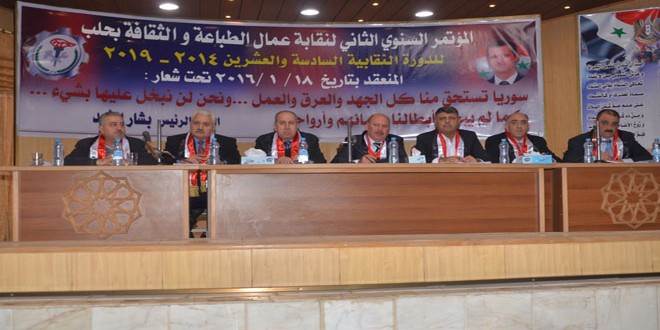 طالب أعضاء مؤتمر نقابة عمال الطباعة والثقافة والإعلام في حلب إقامة دورات تثقيفية وإعلامية للعمال وتخصيص صفحة في جريدة الكفاح العمالي لأصحاب المواهب وتأمين بديل لاستهلاكية “الكلاسة” في الأحياء الآمنة وتفريغ جزئي لرؤساء اللجان النقابية وتسهيل إجراءات استلام مساعدة صندوق التكافل الاجتماعي وإعادة النظر باللباس العمالي من حيث القيمة والجودة وتوحيده لكل العاملين.