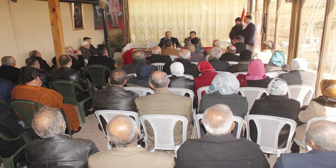 بعد ذلك عقد مخلوف لقاء جماهيريا مع الأهالي واستمع منهم إلى مطالبهم التي تمحورت حول تخفيض ساعات تقنين التيار الكهربائي والعدالة بالتقنين وزيادة مخصصات المازوت للأهالي نظرا لبرودة الطقس في المنطقة وتأمين عدد من وسائط النقل لتلبية احتياجات المواطنين وخاصة طلاب الجامعات وتأمين رافعة كهربائية لمكتب طوارئ الكهرباء وصيانة بعض الطرقات.
