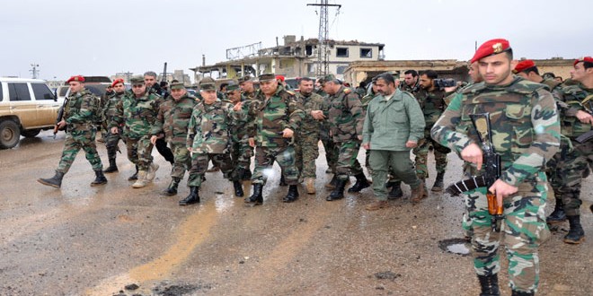 بتوجيه من السيد الرئيس الفريق بشار الأسد القائد العام للجيش والقوات المسلحة قام العماد علي عبد الله أيوب رئيس هيئة الأركان العامة للجيش والقوات المسلحة يرافقه عدد من ضباط القيادة العامة بجولة ميدانية تفقد خلالها وحداتنا العاملة في مدينة الشيخ مسكين بريف درعا الشمالي بعد إعادة الأمن والاستقرار إليها.