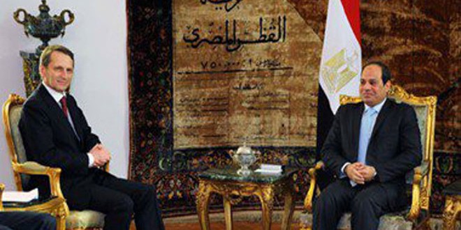 ناقش الرئيس المصري عبد الفتاح السيسي اليوم مع رئيس مجلس الدوما الروسي سيرغي ناريشكين الجهود المبذولة لمكافحة الإرهاب وعددا من القضايا الإقليمية والدولية ذات الاهتمام المشترك.