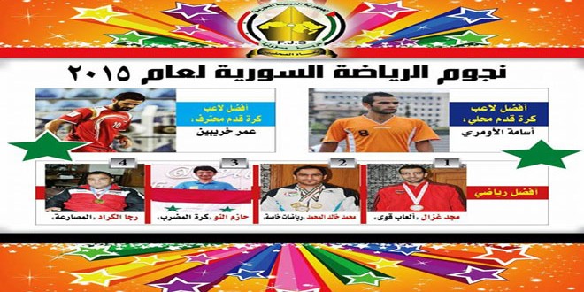 وسيتم خلال الاحتفالية تكريم اللاعبين الذين فازوا في الاستفتاء الذي أجرته اللجنة لاختيار نجوم الرياضة السورية لعام 2015 وهم.. أسامة أومري وعمر خريبين /كرة قدم/ ومجد الدين غزال /ألعاب قوى/ ومحمد خالد المحمد /رياضات خاصة/ وحازم النو /كرة مضرب/ ورجا الكراد / مصارعة/ وتكريم ممثلي وسائل الإعلام المحلية إضافة إلى بعض الفقرات الأخرى.