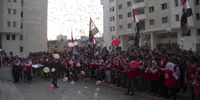 نفذ شباب تجمع الوحدة الوطنية التطوعي اليوم فعالية وطنية ضمن حملة “كل الحب لسورية” في السكن الجامعي بكلية الهندسة الميكانيكية والكهربائية بجامعة دمشق وذلك استكمالا لمبادرة أطول رسالة في العالم وفاء للوطن وقائده السيد الرئيس بشار الأسد.