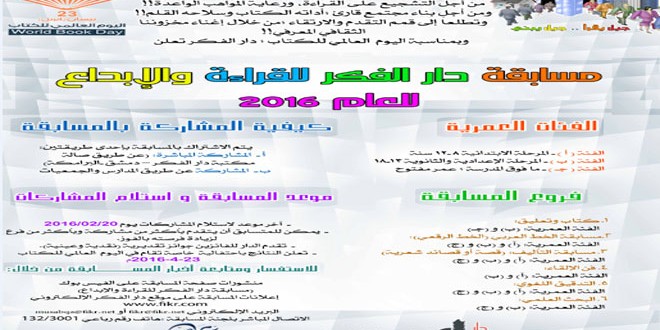 في إطار الأنشطة التي يعدها فريق عمرها الشبابي للاحتفال باليوم العالمي للكتاب والذي يصادف سنويا الثالث والعشرين من نيسان أطلق الفريق مؤخرا بالتعاون مع فريق كوكب عبقر ومكتبة دار الفكر مسابقة القراءة واالإبداع تحت شعار جيل قارئ.. جيل يبني حيث تهدف المسابقة التي تعلن نتائجها ضمن احتفالية خاصة تقام في يوم الكتاب العالمي الى بناء مجتمع قارىء أداته الكتاب وسلاحه القلم يتطلع الى الارتقاء بافراده عبر إغناء مخزونه الثقافي والمعرفي.