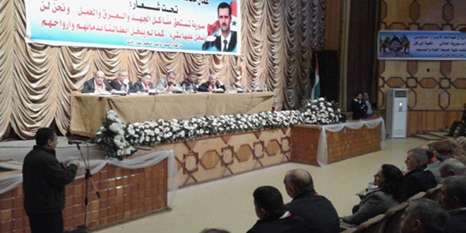محافظ اللاذقية ابراهيم خضر السالم أكد دور الطبقة العاملة في التصدي للهجمة الإرهابية الشرسة التي تتعرض لها سورية فيما نوه أمين فرع اللاذقية لحزب البعث العربي الاشتراكي الدكتور محمد شريتح بالتزام العمال في مواقع عملهم ووقوفهم صفا واحدا مع الجيش العربي السوري في حربه ضد الإرهاب كل في موقعه.