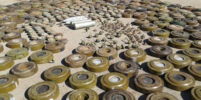 وذكر مصدر في المحافظة في تصريح لمراسل سانا إنه “خلال عمليات المتابعة لنشاط التنظيمات الارهابية ونقلها للاسلحة والذخائر بين ريف السويداء الغربي وريف درعا الشرقي تم التأكد من اعدادها لنقل كمية كبيرة من الألغام إلى البادية عبر خربة الغوثة”.