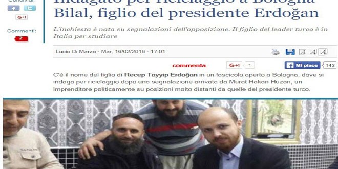 وكان محام إيطالي رفع بداية كانون الأول الماضي طلبا أمام القضاء الإيطالي لإجراء تحقيق مع ابن رئيس النظام التركي بتهمة غسيل الأموال في وقت تلاحق تهم الفساد أردوغان نفسه وخصوصا فيما يخص سرقة النفط السوري والعراقي من خلال التعاون مع تنظيم داعش الإرهابي مقابل إمداده بالسلاح وتأمين الدعم له وفضائح الفساد والرشاوى التي تورط بها اردوغان ومسؤولون في حزبه ووزراء في الحكومة ومقربون منه.