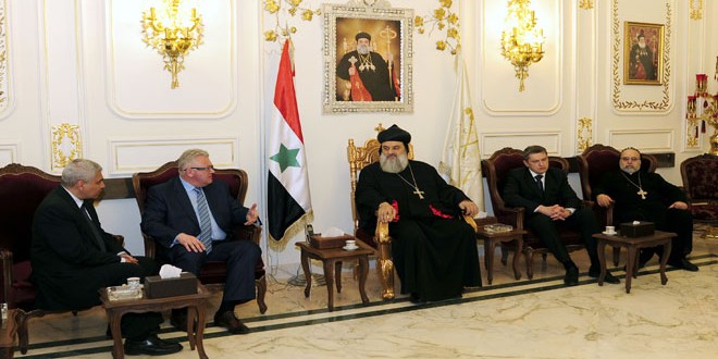 وقال قداسة البطريرك افرام الثاني خلال لقائه اليوم السكرتير الاول للجنة المركزية للحزب الشيوعى البيلاروسي كاربينكو ايغور فاسيليفيتش في كاتدرائية مار جرجس البطريركية بدمشق أن ابناء سورية مسلمين ومسيحيين متمسكون بارضهم ومتجذرون فيها ومصرون على الدفاع عنها في مواجهة المؤامرة التي تستهدفها لافتا الى ان سورية تدافع عن كل ما يهم الانسان وحضارته وانسانيته نيابة عن العالم اجمع.