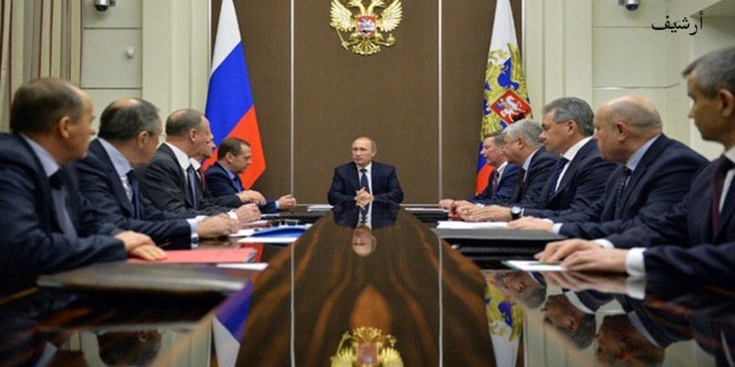 بحث الرئيس الروسي فلاديمير بوتين اليوم مع الأعضاء الدائمين لمجلس الأمن الروسي الوضع في سورية وفي أسواق النفط العالمية بالإضافة إلى الشؤون الداخلية الروسية.