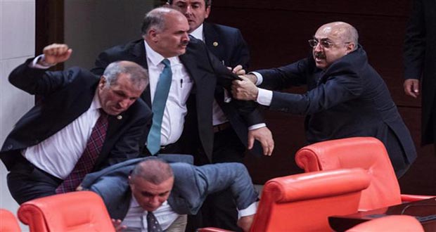 نشب عراك بالأيدي خلال جلسة للبرلمان التركي أمس بين نواب من حزب الحركة القومية المعارض ونواب من حزب العدالة والتنمية الحاكم على خلفية انتقاد حزب الحركة القومية للسياسات التي تنتهجها حكومة رجب طيب اردوغان.