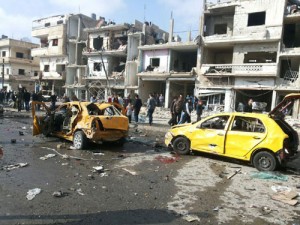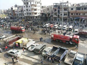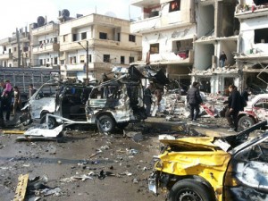 وقال المصدر في تصريح لـ سانا إن إرهابيين فجروا بعد ظهر اليوم سيارة مفخخة بكمية كبيرة من المتفجرات تبعها تفجيران انتحاريان بحزامين ناسفين بعد تجمع المواطنين لإسعاف الجرحى.