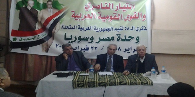 أكدت قوى قومية عربية خلال الندوة التي أقيمت بالمنتدى الثقافي المصري في القاهرة بمناسبة الذكرى الـ 58 للوحدة بين سورية ومصر أن المخطط الصهيوأمريكي الساعي إلى تفتيت سورية وهدم موءسساتها سينتهي بالفشل أمام إنجازات وبطولات الجيش العربي السوري الذي يسطر الملاحم الاسطورية في حربه ضد قوى التكفير والارهاب والرجعية.