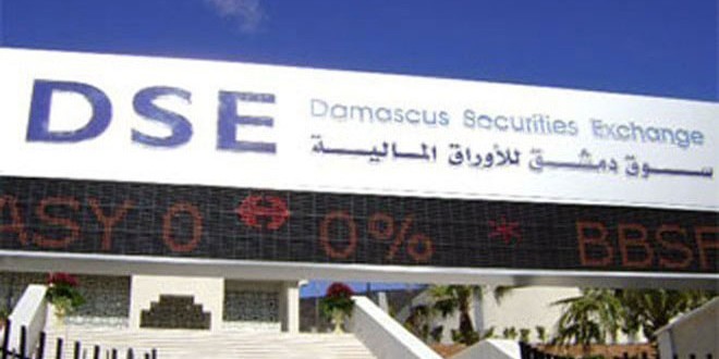 أغلقت جلسة تداولات سوق دمشق للأوراق المالية اليوم على حجم تداول قدره 177713 سهما موزعة على 102 صفقة بقيمة تداولات إجمالية بلغت 9ر23 مليون ليرة وارتفع مؤشر السوق 36ر17 نقطة عن الجلسة الماضية وبنسبة تغير موجبة قدرها 28ر1 بالمئة ليغلق عند قيمة 33ر1369 نقطة مرتفعا عن بداية العام بنحو 142 نقطة.