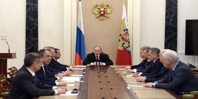 بحث الرئيس الروسي فلاديمير بوتين مع الأعضاء الدائمين في مجلس الأمن الروسي المسائل المتعلقة بتنفيذ الاتفاق الروسي الأمريكي لوقف الأعمال القتالية في سورية.