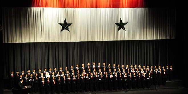 كما قدم كورال هيئة مدارس بنات وأبناء الشهداء بقيادة عماد طرقجي بأنغام أصواتهم وبراءة أحلامهم مجموعة من الاغاني الوطنية التي عبروا من خلالها عن محبتهم لوطنهم ومنها.. سورية يا حبيبتي- موطني -انا سوري وأرضي عربية التي لاقت تصفيقا من جمهور المسرح.