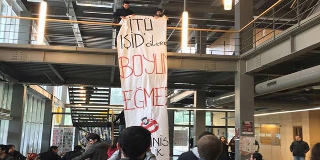 وأشار الموقع إلى أن عناصر الأمن الخاص في الجامعة حاولوا منع فعاليات الطلاب المناهضين لداعش كما تهجموا على الطلاب محاولين انزال اللافتة التي كتب عليها “جامعة اسطنبول التقنية لا تنحني أمام داعش” مؤكدين انهم لن يسمحوا بالدعاية ضد التنظيم.