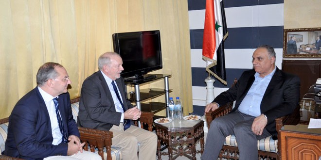 بحث محافظ حمص طلال البرازي مع المدير التنفيذي لمنظمة الأمم المتحدة للطفولة “يونيسيف” أنتوني ليك مساء اليوم في مبنى المحافظة موضوع تقديم المساعدات التعليمية والصحية للأطفال في ظل الآثار النفسية السيئة التي تركها الإرهاب عليهم.