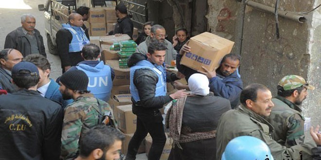بدعم من الحكومة السورية وبإشراف اللجنة العليا للإغاثة واصلت الهيئة العامة للاجئين الفلسطينيين العرب ووكالة الأمم المتحدة لإغاثة وتشغيل اللاجئين الفلسطينيين الأونروا توزيع المساعدات الغذائية والطبية على أهالي مخيم اليرموك الذين غادروا المخيم هربا من جرائم التنظيمات الإرهابية وفي مقدمتها تنظيم “داعش”.