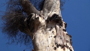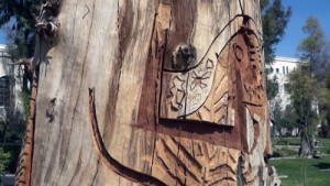 بدوره قال النحات المليح..”إن الشجرتين اللتين نشتغل عليهما حالياً مرتبطتان بالذاكرة الوطنية في هذا المكان حيث لا يقل عمرهما عن مئة عام لذلك اعتمد فريق العمل عدة أساليب فنية في النحت منها التكعيبية المعمارية والرمزية مع محاولة تجسيد الأسطورة السورية والتاريخ الحضاري السوري عبر اعتماد الرموز والنقوش القديمة للدفاع عن الآثار السورية العريقة وللتعريف بها محلياً وعالمياً في ظل ما تتعرض له آثارنا وحضارتنا من تدمير ممنهج في ظل الحرب على سورية”.