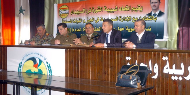 نظم فرع منظمة اتحاد شبيبة الثورة بالسويداء بالتعاون مع الإدارة السياسية اليوم ندوة تعريفية حول مزايا المرسوم التشريعي رقم 8 لعام 2016 القاضي بمنح عفو عام عن جرائم الفرار الداخلي والخارجي المنصوص عليها في قانون خدمة العلم .