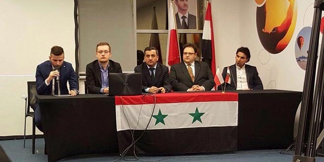 نظمت السفارة السورية في وارسو بالتعاون مع فرع بولندا للاتحاد الوطني لطلبة سورية ندوة سياسية تحت عنوان “يدا بيد نبني سورية الغد” بحضور حشد من أبناء الجالية وطلبتنا الدارسين في الجامعات البولندية جرى خلالها عرض ثلاثة أفلام وثائقية تظهر بعض الجرائم والمجازر التي ارتكبتها التنظيمات الإرهابية بحق الشعب السوري.